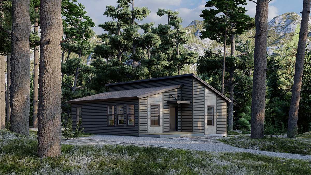For fans of modern home style, the Nautilus Ranch can be your dream getaway or your ideal "right-sized" full-time home. At just 1020 square feet, the is open plan feels much larger with its bright and open design. You'll enjoy your favorite views from the rear facing kitchen/dining area as well as room for family and friends in the connected living areas. The large, kitchen island is great for meal prep and includes seating space for casual dining. The split bedroom plan features a nicely sized secondary bedroom and a private owner retreat with an ensuite bath with a double vanity and shower.